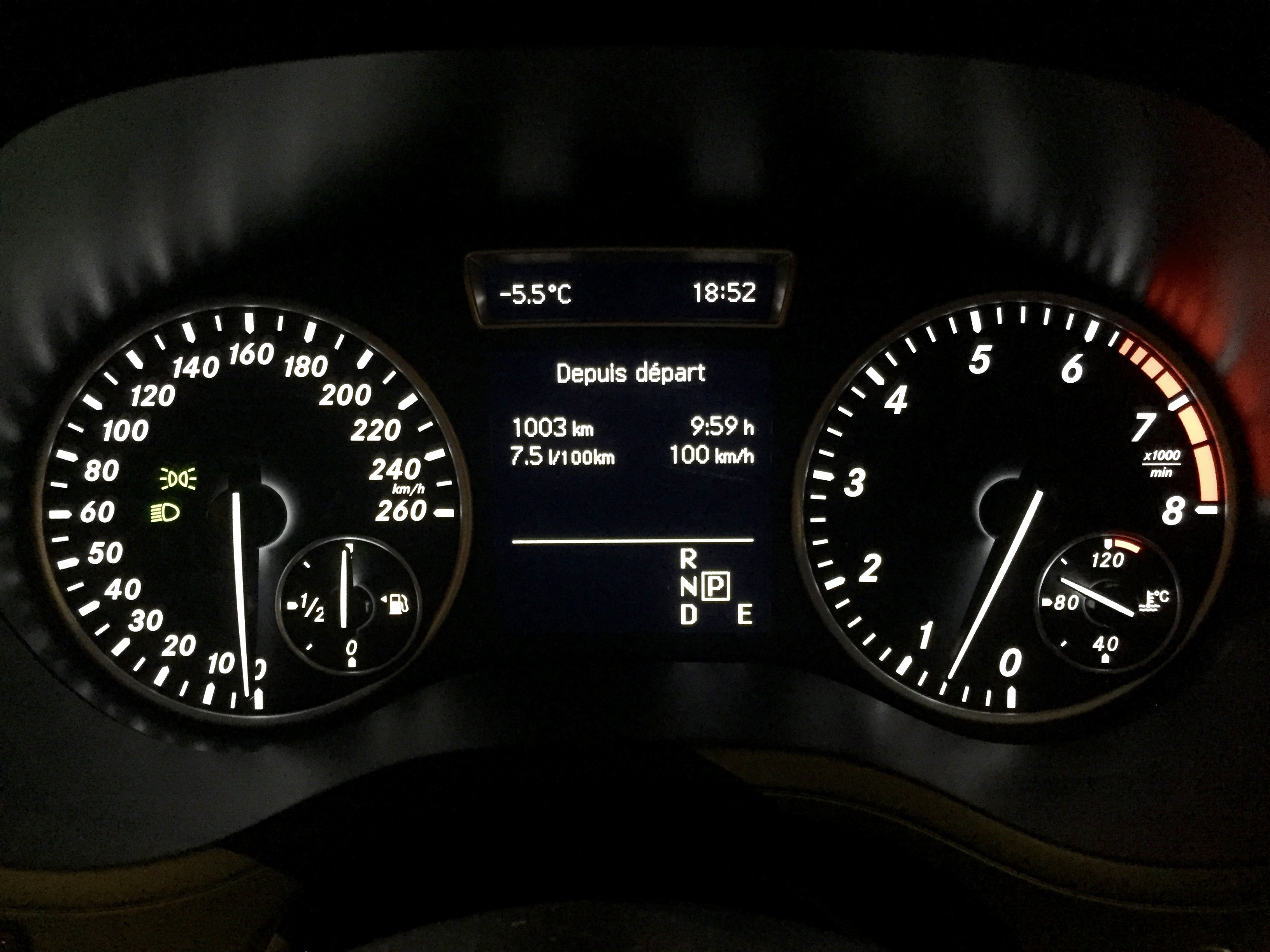 Le panneau de contrôle nous indique un parcours de 1003 km en 9:59 H en une moyenne de 100Km/H avec une consommation de 7,5L/100km; Pas mal !!