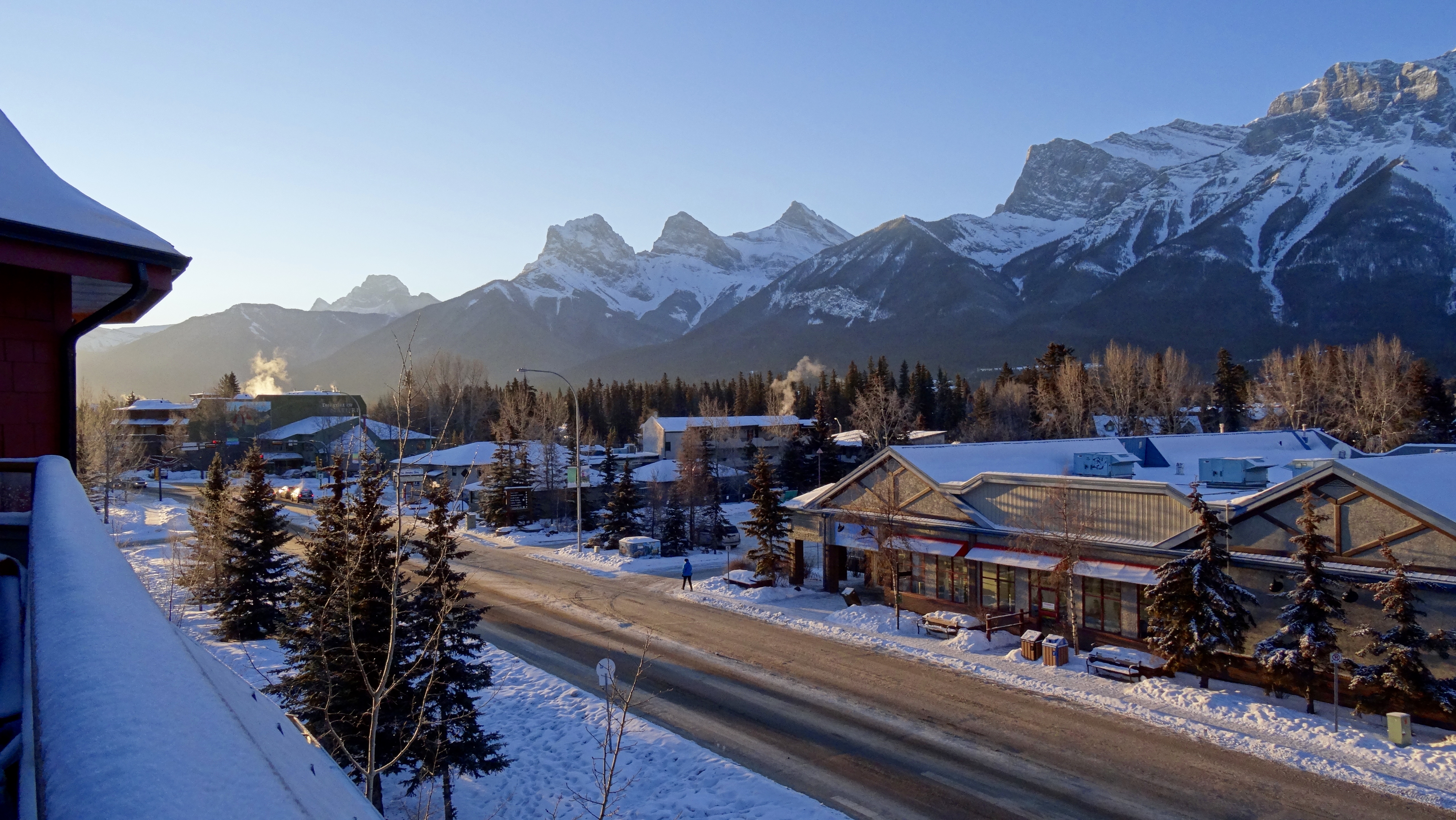 En effet, Canmore est une localité qui a su très bien conserver son aspect des plus pittoresques tout en y intégrant tous les services nécessaires à sa population et celle environnantes: par exemple, notre immeuble, se situe dans la nouvelle section commerciale et dans un stationnement d’un Smart Centre ou on y retrouve Canadian Tire, Safeway, Starbucks, Sport Expert, Liquor Store etc mais, avec les arbres ajoutés partout, les trottoirs surélevés prioritaires, les petits bancs de parc ici et là, font en sorte que l’intégration est parfaite avec l’environnement et on a vraiment pas l’impression d’un grand stationnement.